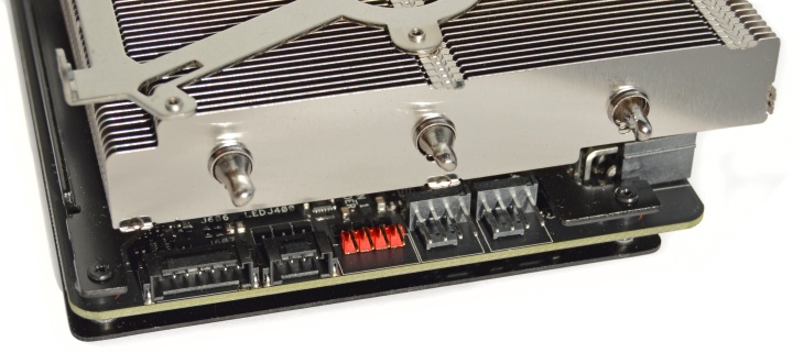 В углу платы есть два миниатюрных переключателя. Это кнопка отключения подсветки и переключатель BIOS. У видеокарты две прошивки с разным алгоритмом управления вентиляторами.