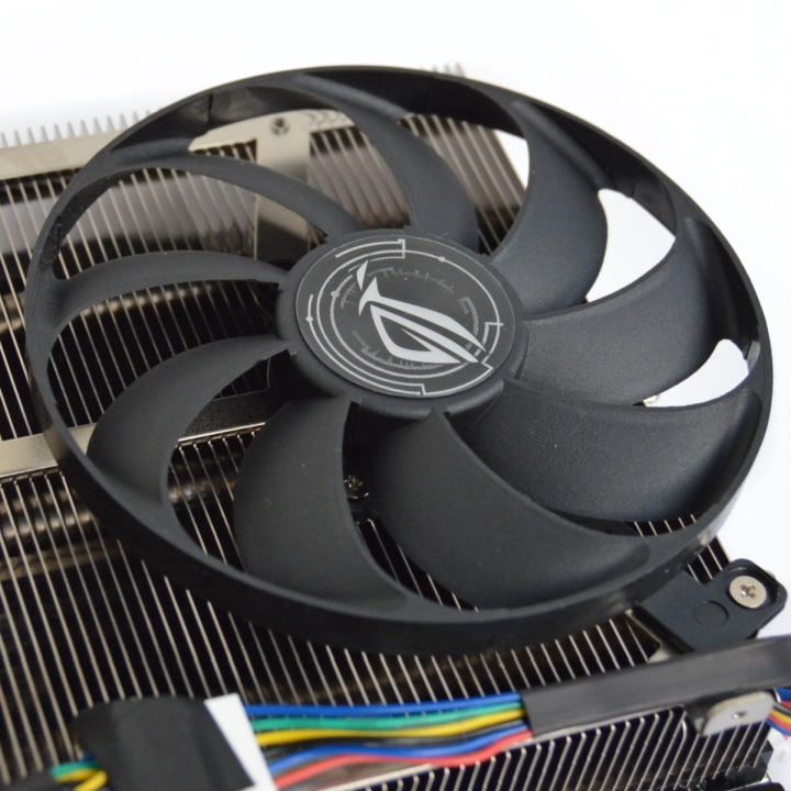 Сбоку выглядывает ребро жесткости с названием видеокарты, которое является продолжением радиатора, накрывающего плату. Есть подсвечиваемое окошко Republic of Gamers.