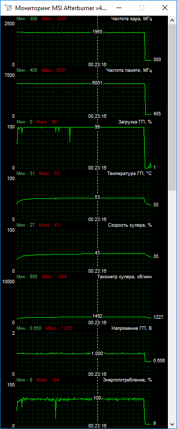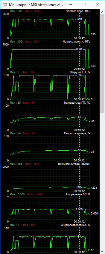 При стандартных заводских установках видеокарта показала частоту ядра на уровне 1965–1980 МГц при редких пиковых значениях до 2025 МГц. Это выше частот MSI Gaming X, несмотря на якобы более высокий Boost Clock в спецификациях. При тестировании на открытом стенде видеокарта прогревалась до 53–54 °С в игровом режиме, скорость вентиляторов до 1500 об/мин, шум минимальный. Ниже это проиллюстрировано на скриншотах мониторинга при нагрузке Final Fantasy XV Windows Edition benchmark и Shadow of the Tomb Raider в разрешении 2560x1440. Температура внутри помещения 23 °С.