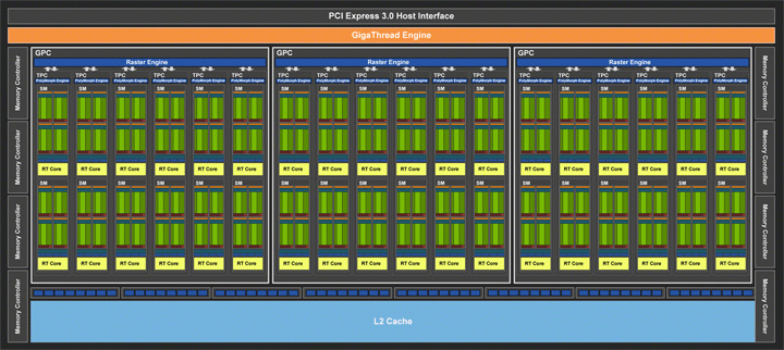 Последние годы NVIDIA следовала определенной стратегии, в которой ускорители среднего класса получали свой отдельный GPU. Но в случае GeForce RTX 2060 все иначе, в основе новинки процессор TU106 от старшего видеоадаптера GeForce RTX 2070, но в урезанной конфигурации. Полная версия GPU насчитывает 36 SM с 2304 потоковыми процессорами CUDA. У GeForce RTX 2060 осталось 30 активных SM на 1920 потоковых процессоров. Попутно уменьшилось число текстурных блоков — со 144 до 120. Меньше и новых специализированных блоков: активно 240 тензорных ядер и 30 ядер RT для трассировки.
