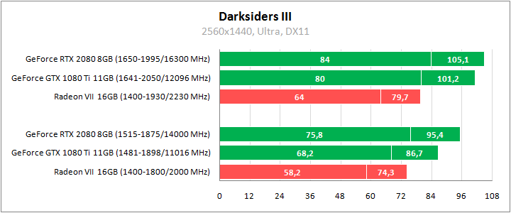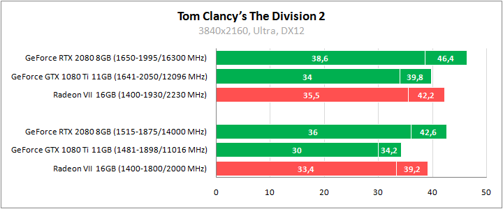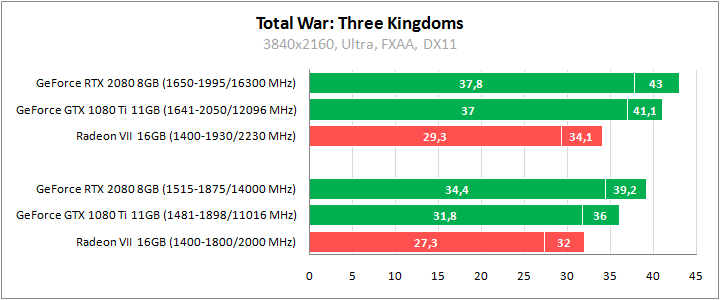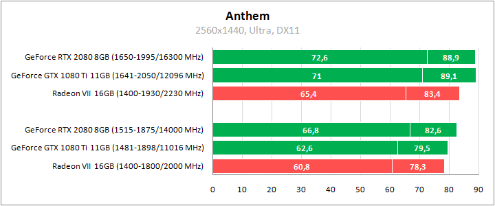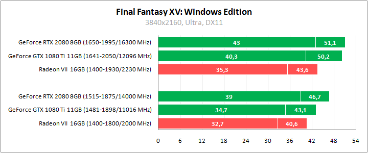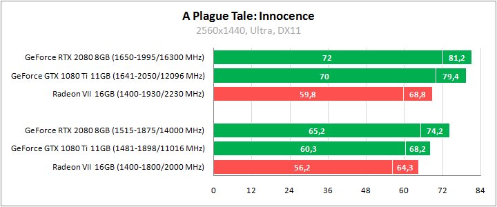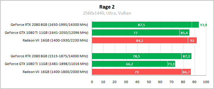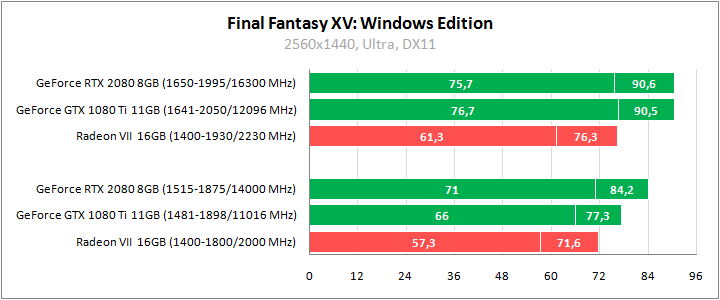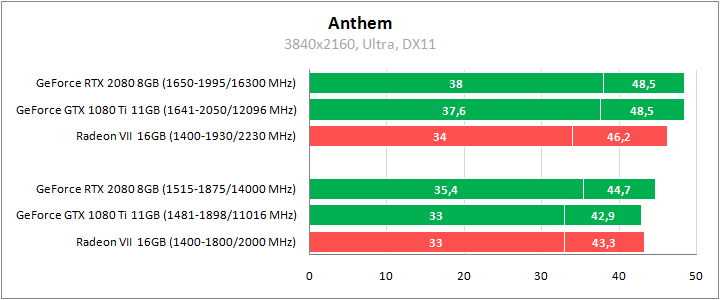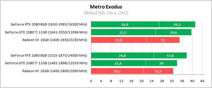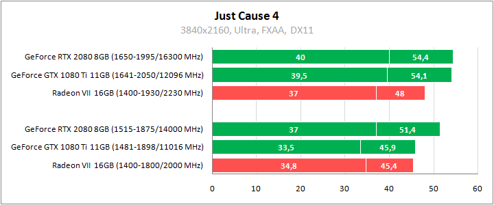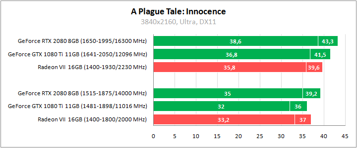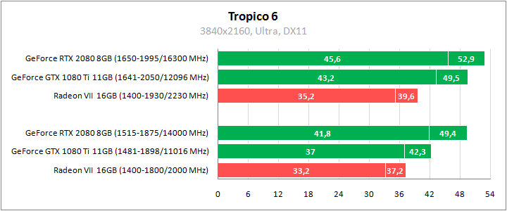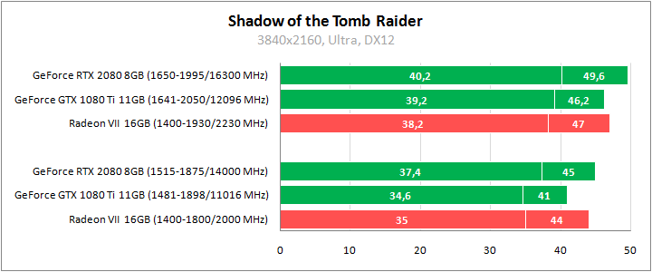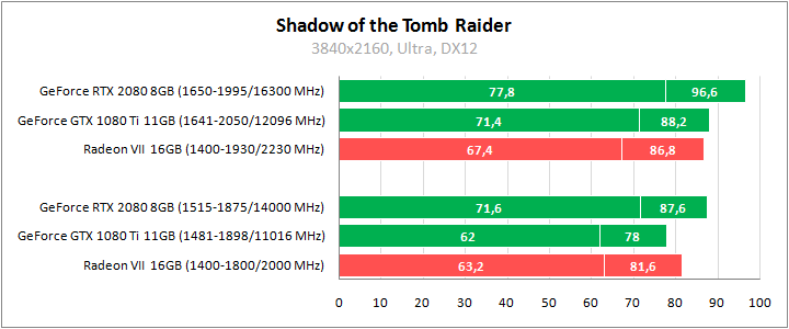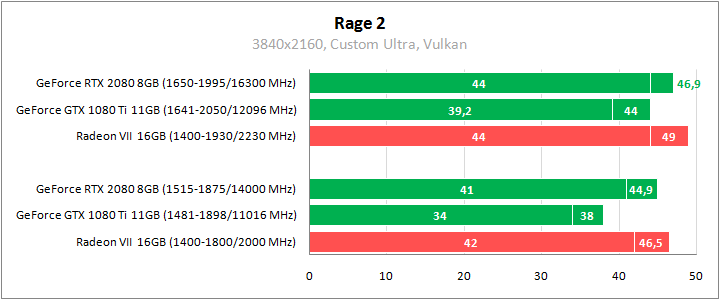 Относительно старых тестирований выросли результаты видеокарт в разрешении 2560x1440, но в 4K картина осталась неизменной. Radeon VII имеет небольшое преимущество относительно GeForce GTX 1080 Ti. Лидирует GeForce RTX 2080, разгон повышает его результаты на 10%.