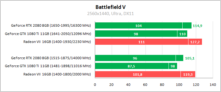 У GeForce RTX 2080 и Radeon VII паритет в разрешении 2560x1440, но в 4K второй вырывает победу с небольшим преимуществом. GeForce GTX 1080 Ti уступает герою обзора 18–20% в номинале и 7–13% в разгоне.