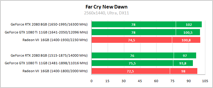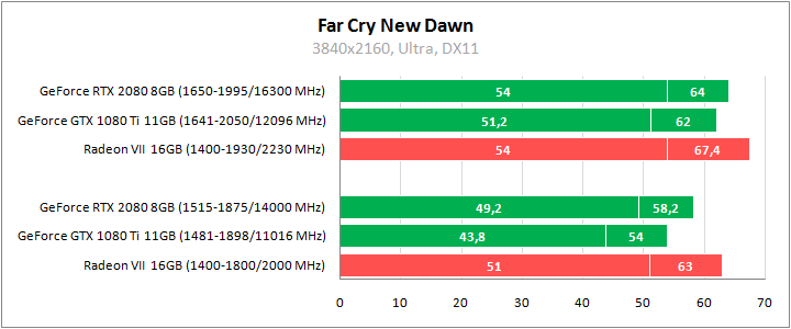 В разрешении 2560x1440 общая производительность в Far Cry New Dawn уперлась в процессор, и разница между участниками минимальна. В 4K лидирует Radeon VII, результаты GeForce RTX 2080 ниже на 4–8%.