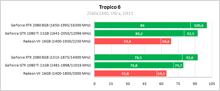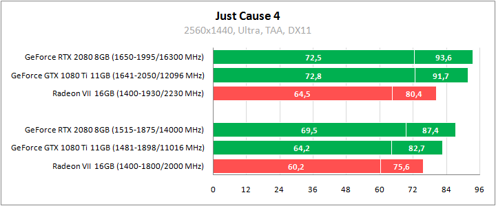 В меньшем разрешении GeForce RTX 2080 показывает преимущество над GeForce GTX 1080 Ti в 14–16%, в 4K это меньше 9%. Разница между лидером и Radeon VII до 23%. Разгон ускоряет GeForce RTX 2080 на 9%.