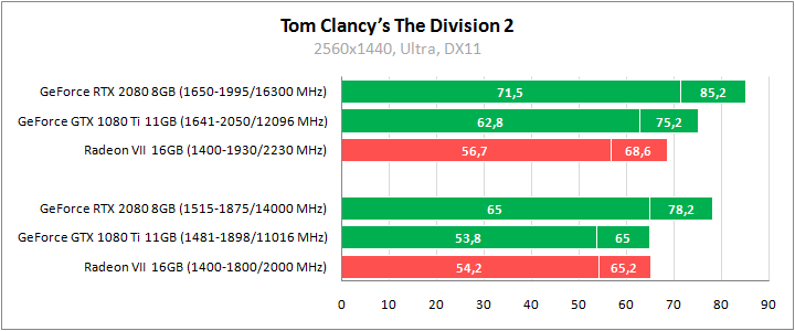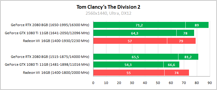 Отличные результаты в меньшем разрешении. Играть в 4K возможно разве что после разгона, но без небольшого снижения настроек тоже не обойтись. Первое место у GeForce RTX 2080. Референсный видеоадаптер GeForce GTX 1080 Ti показывает результаты на уровне Radeon VII, выходя вперед за счет повышения частот.