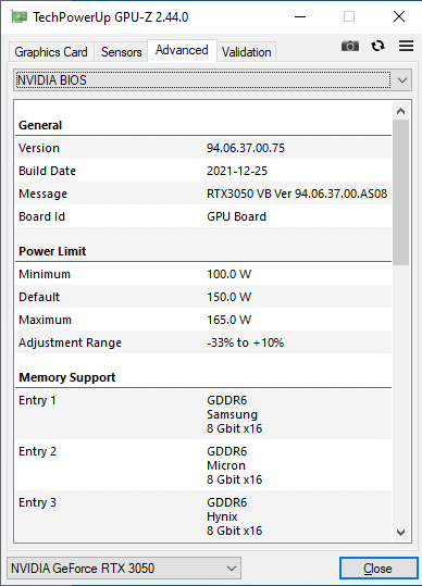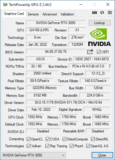 Урезание блоков относительно GeForce RTX 3060 позволило уменьшить мощность до 130 Вт. Также стоит отметить урезание интерфейса PCI Express до 8 линий. Это может немного ограничивать потенциал на старых платформах с PCI-E 3.0, но вряд ли критично для видеокарты такого уровня быстродействия. GeForce RTX 3050 относятся к серии LHR (Low Hash Rate), т.е. имеют встроенный ограничитель производительности для майнинга Ethereum. Хотя согласно последним новостям эту защиту можно взломать.