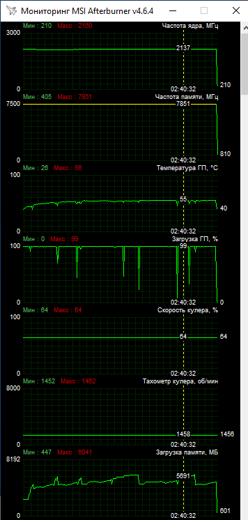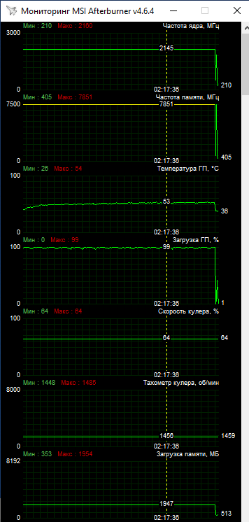 По умолчанию включена прошивка Performance, которая обеспечивает более высокие обороты вентиляторов для пониженных рабочих температур. При этом в условиях открытого корпуса температура GPU не превышала 57 °C (в помещении 22 °C). Столь низкий нагрев достигался при скорости вентиляторов 1100-1200 об/мин. То есть видеокарта оказалась весьма холодной и тихой — идеальное сочетание. В качестве примера ниже скриншоты мониторинга во время длительной нагрузки стресс-тестом 3DMark Time Spy и Days Gone. Частота процессора держалась в рамках 1987-2002 МГц и кратковременными пиковыми значениями до 2010 МГц.