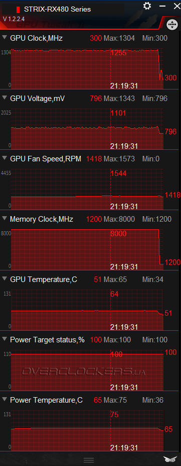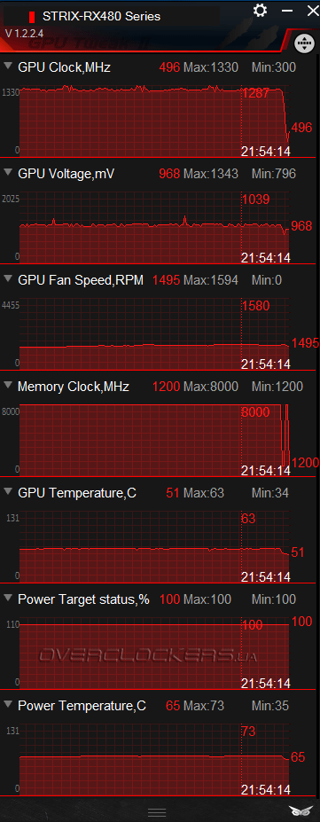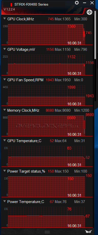 Разгон памяти можно назвать стандартным для Radeon RX 480. А вот 1365 МГц по ядру — это реальное достижение на фоне того разгона, что демонстрировал у нас реферерсный видеоадаптер. Такая частота далась ASUS при небольшом повышении напряжении, более высокие частоты приводили к артефактам или внезапному троттлингу. Последнее один раз случилось и при 1365 МГц, так что будем считать данное значение пределом возможностей для Strix.