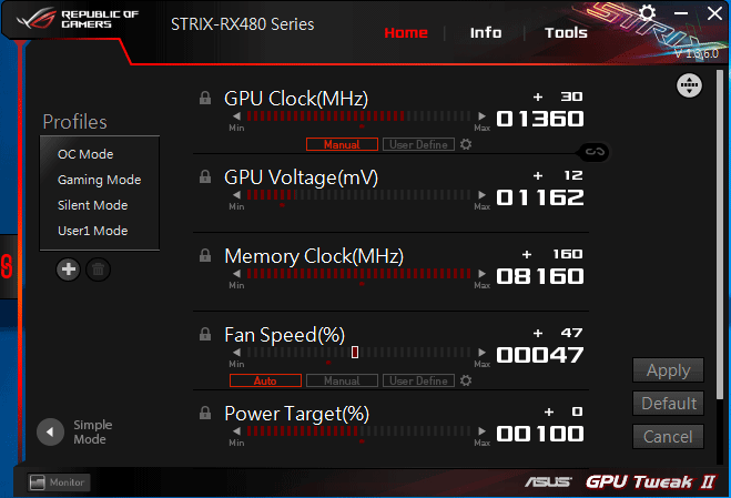 Для разгона новых Radeon можно применять приложение WattMan, которое является частью программного комплекса AMD Settings, или специализированные утилиты от производителей видеокарт. ASUS GPU Tweak II поддерживает все функции разгона и мониторинга видеокарт семейства Polaris. Если говорить о наблюдении за параметрами, то в случае с ASUS ROG Strix RX 480 пользователю доступны даже данные с термодатчика VRM и много других расширенных данных. А вот с разгоном есть один нюанс — данное приложение ограничивает частоту памяти, не позволяя поднять ее выше 8160 МГц.