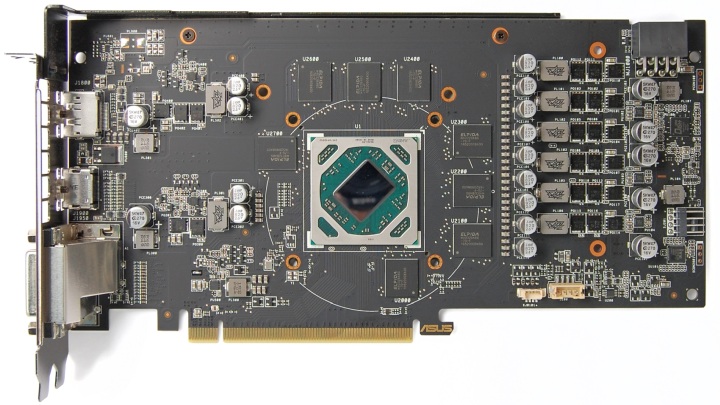 А вот печатная плата заметно отличается от Radeon RX 470. В новой видеокарте ASUS узел питания расположен справа от чипа. Количество фаз в системе питания GPU увеличено до шести.
