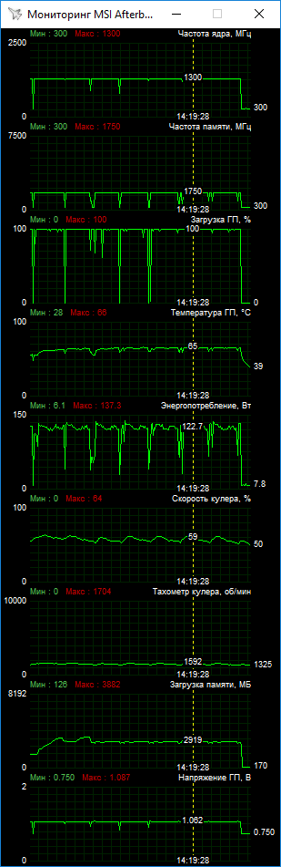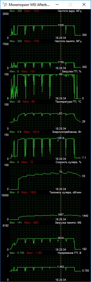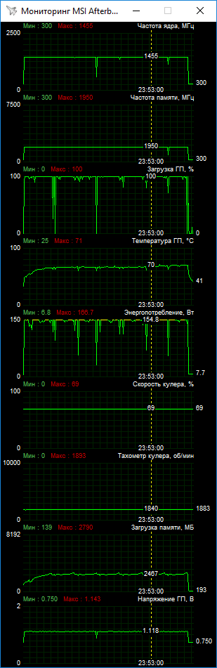 Примечательно, что реализовать такой разгон удалось без существенного ускорения вентиляторов. Практически все игровые тесты были пройдены при фиксации скорости вентиляторов на 69% от максимума (чуть менее 1900 об/мин). Стабилизация скорости оказалась весьма эффективной для улучшения охлаждения, в итоге ядро грелось лишь до 71 °C. А вот общий шумовой фон возрос. При вариативной скорости вращения с пиковыми значениями до 2000 об/мин и выше видеокарта работала тише!