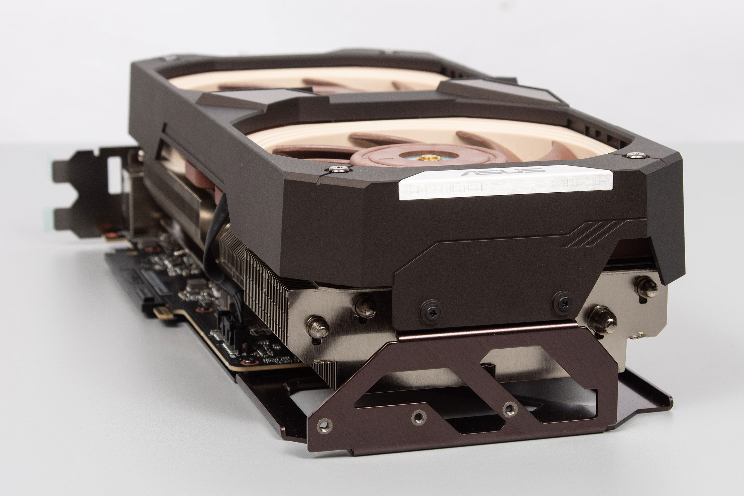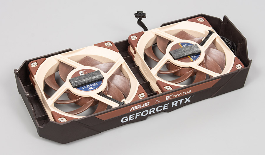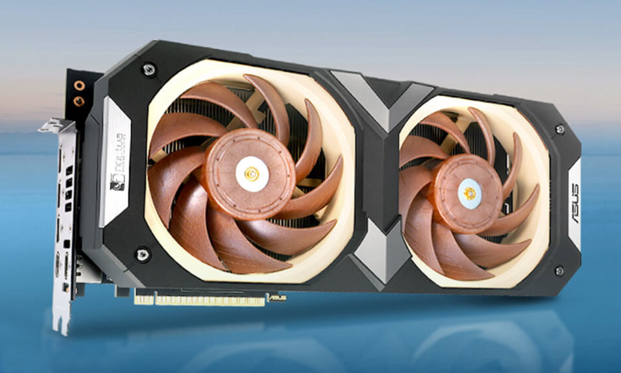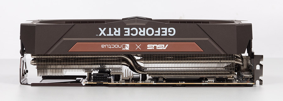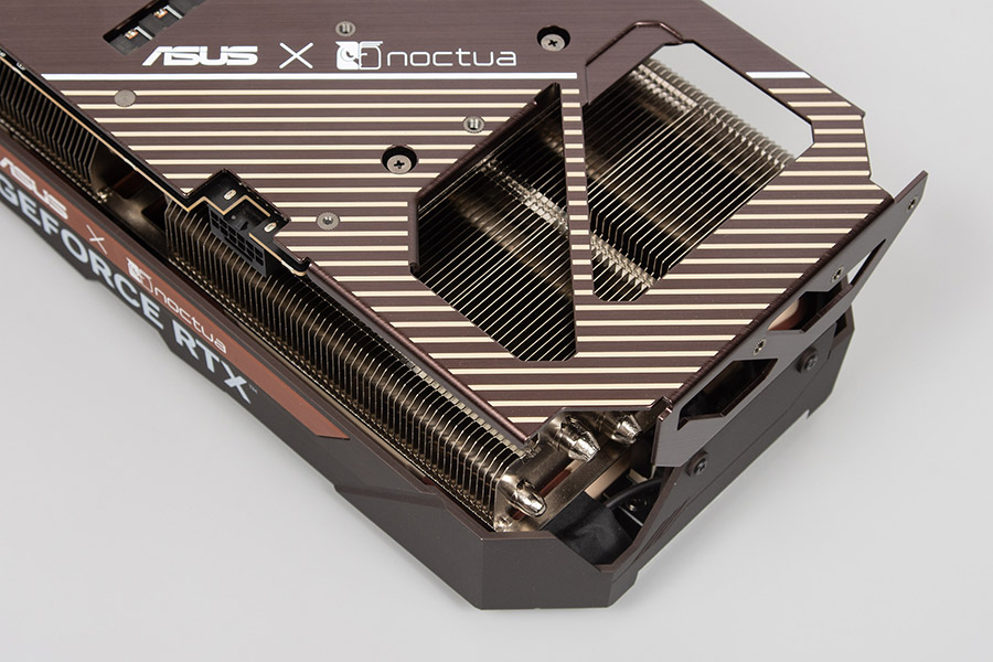 Внешне карта выполнена просто великолепно и напоминает графические адаптеры 15-летней давности, когда на видеокарты устанавливали кулеры сторонних фирм вместо родной системы охлаждения турбинного типа. Коричневый пластиковый кожух накрывает два вентилятора фирменных оттенков Noctua и крепится к задней пластине, которая также коричневого цвета. Все чувствуется монолитным и массивным, а физически — тяжелым, поэтому без подпорки адаптер лучше не использовать. По всей карте есть надписи ASUSxNoctua, что придаст владельцу чувство владения особой вещью.