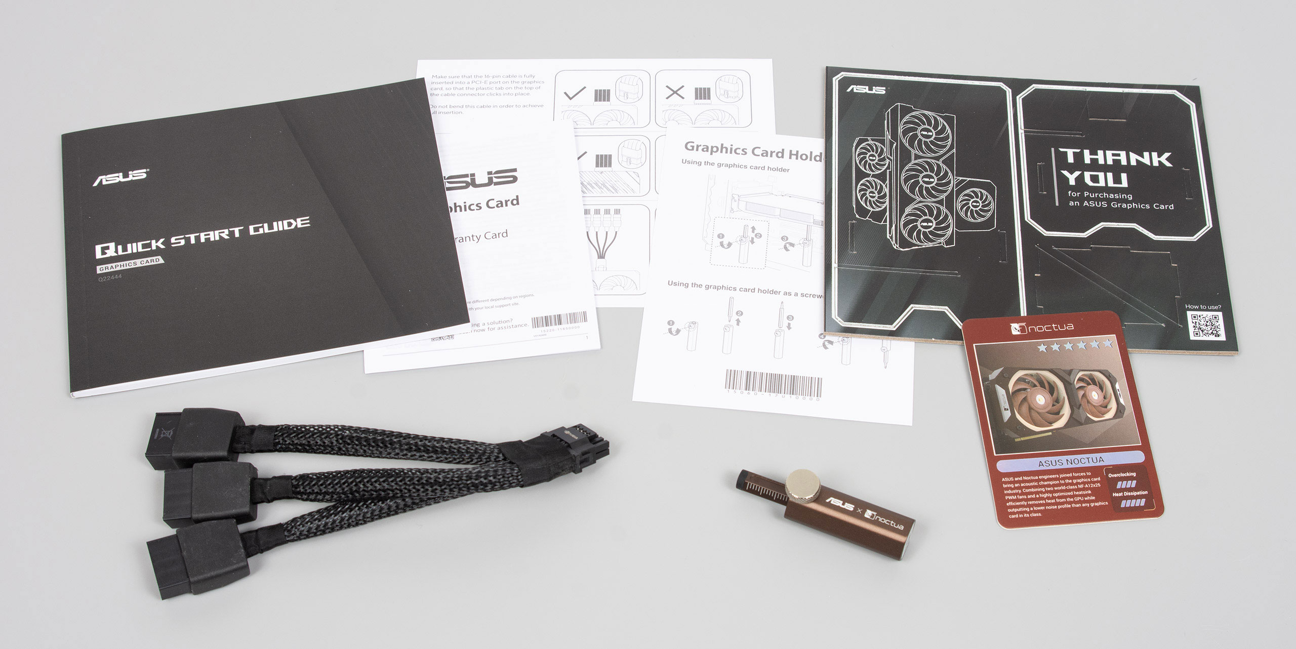 В комплекте имеется документация, пазл-подставка для смартфона, игральная карточка, переходник питания и подпорка-отвертка для видеокарты.