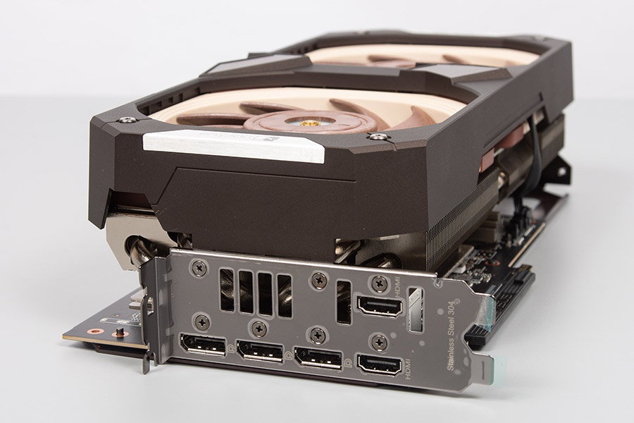 Для охлаждения видеокарты используются два очень популярных вентилятора Noctua NF-A12x25 с ШИМ-управлением. Они работают только тогда, когда графический процессор нагревается до 50 градусов, в то время как при более низкой температуре система охлаждения функционирует в пассивном режиме.