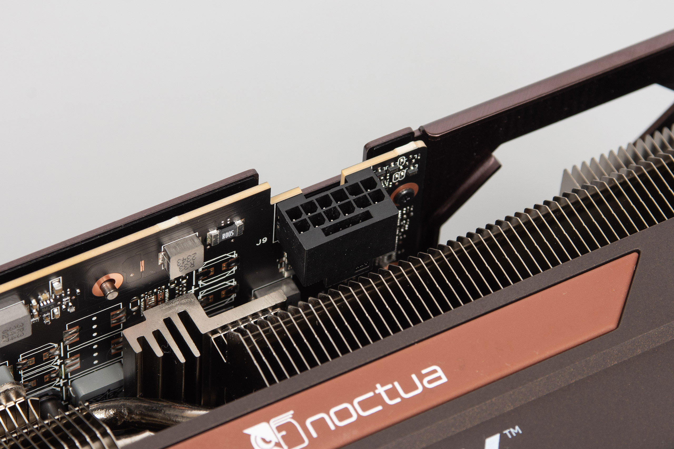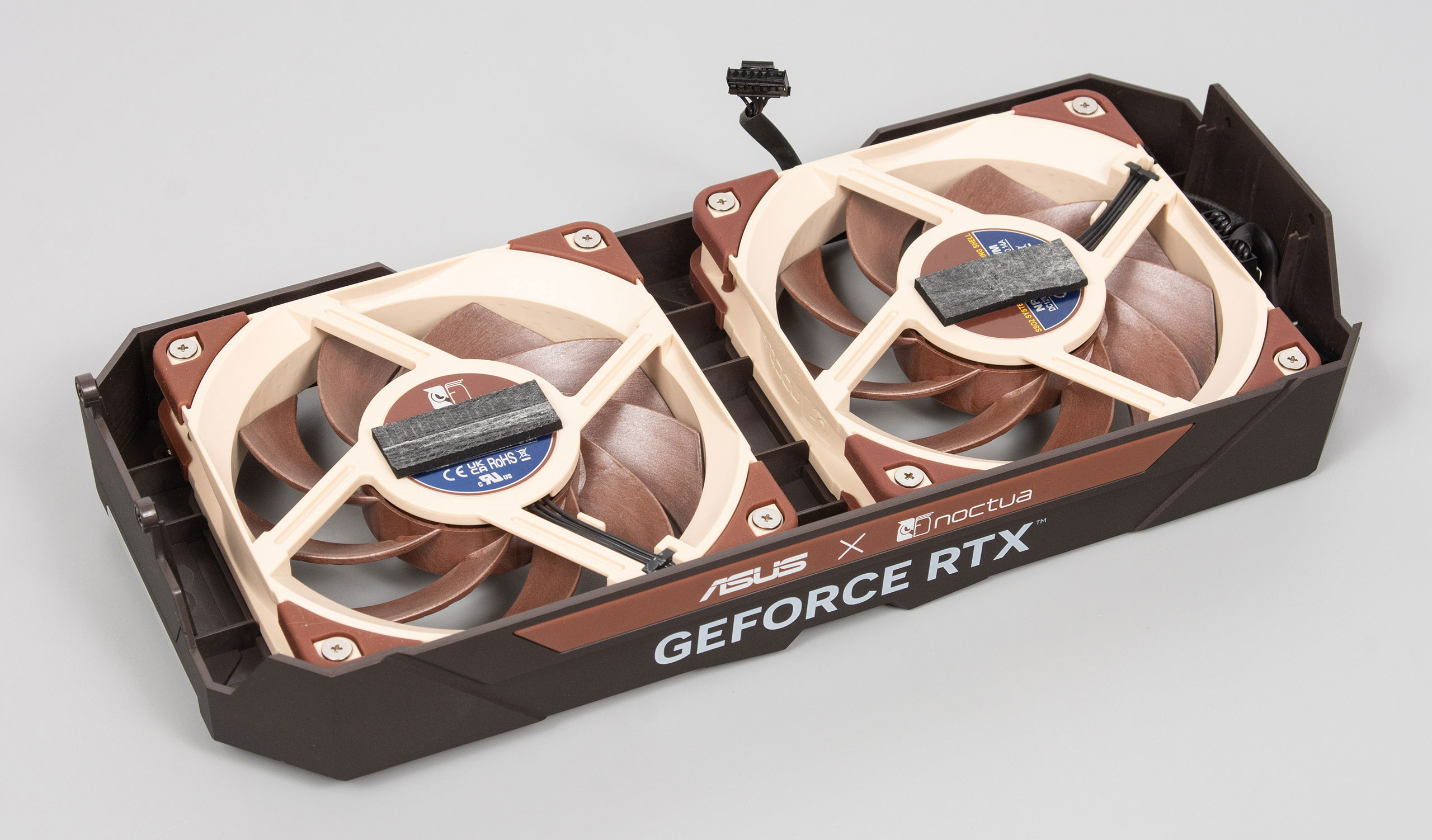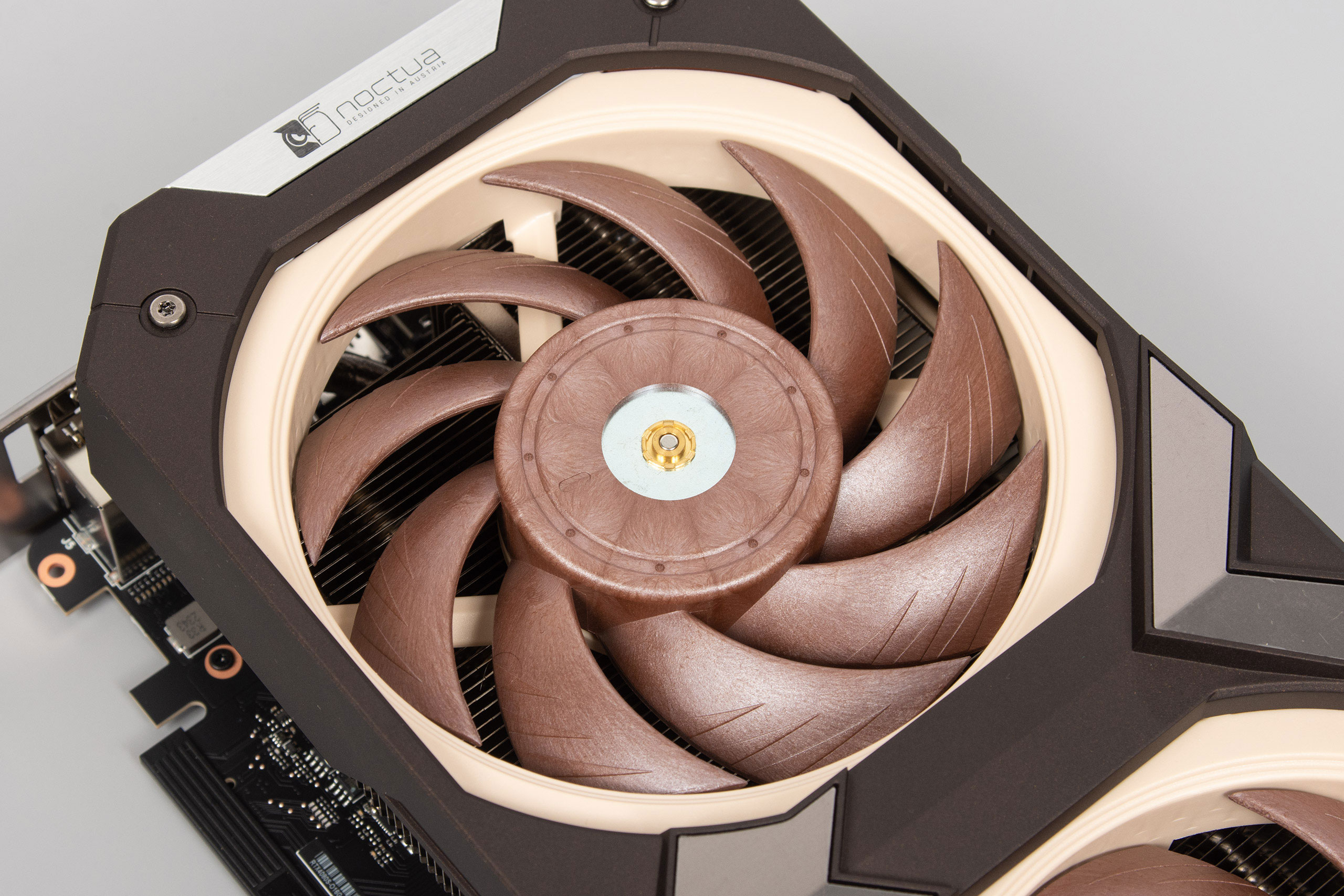 Вентиляторы — стандартные Noctua NF-A12x25 PWM формата 120x120 мм и толщиной 25 мм. Они имеют обычное подключение через 4-контактный разъем, но с коротким кабелем и подсоединяются к хабу в задней части кожуха. Если какой-то вентилятор выйдет из строя — можно будет легко найти ему замену, и в этом очень весомый плюс видеокарт Noctua Edition. Правда, фирменные вентиляторы недешевы.