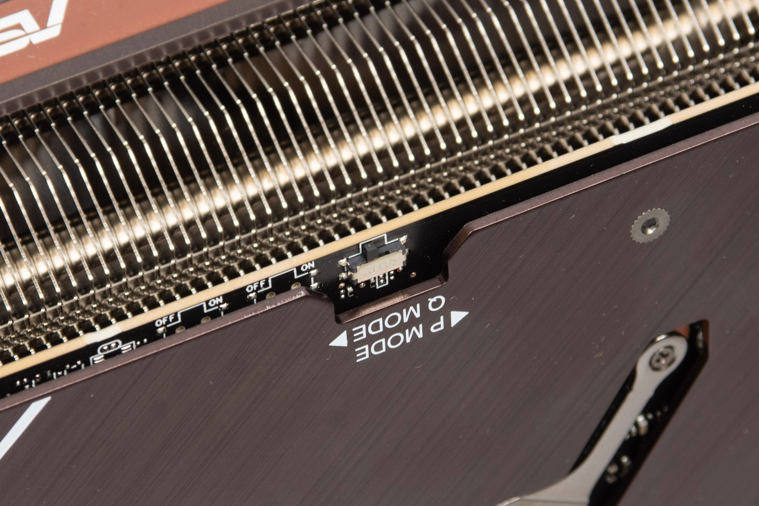Там же, поближе к интерфейсным разъемам, установлен переключатель режимов работы видеокарты. Можно выбрать производительный или тихий, которые отличаются только скоростью оборотов вентиляторов — в Quiet Mode она не превышает 900 об/мин, что делает карту тихой при нагрузке.