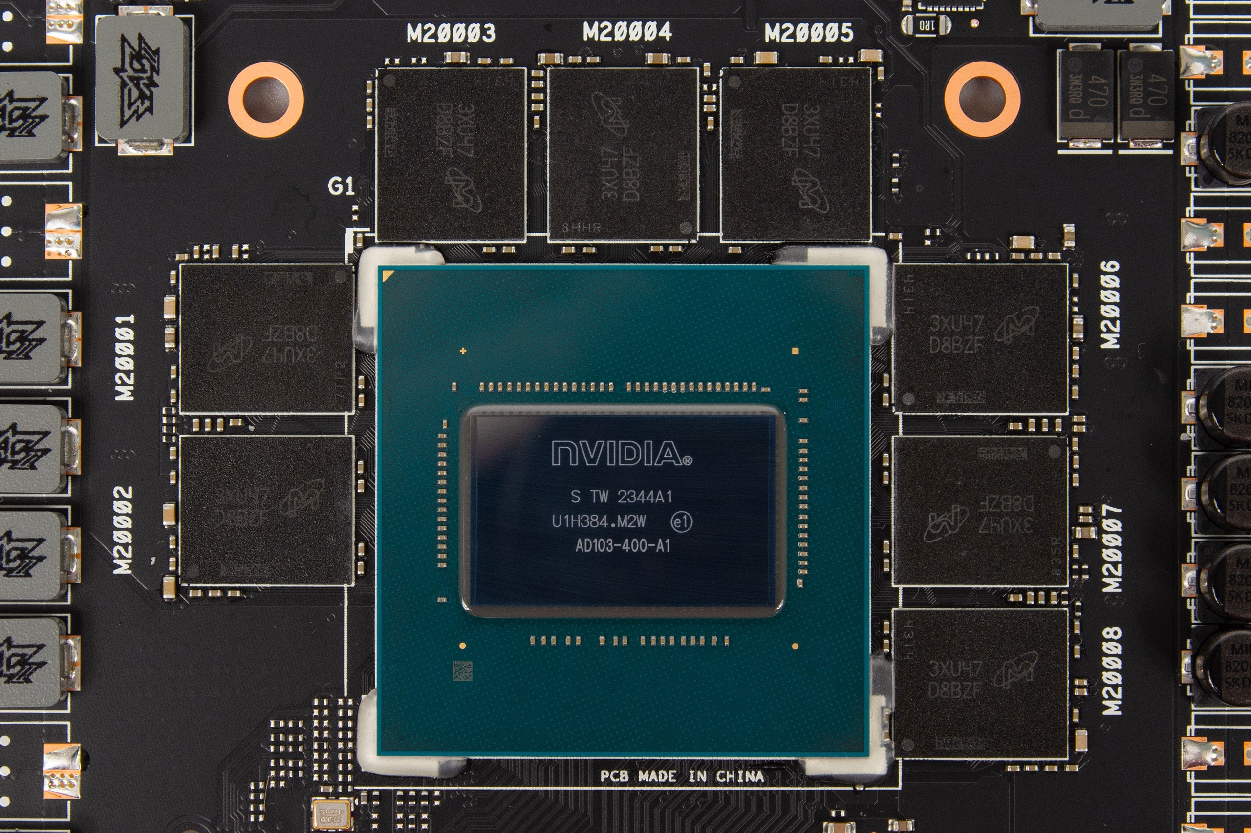 Установленный чип AD103-400-A1 имеет продолговатую форму и лишен защитной рамки. С памятью Micron D8BZF (MT61K512M32KPA-24:U) в количестве восьми микросхем общим объемом 16 ГБ он взаимодействует через 256-битную шину.