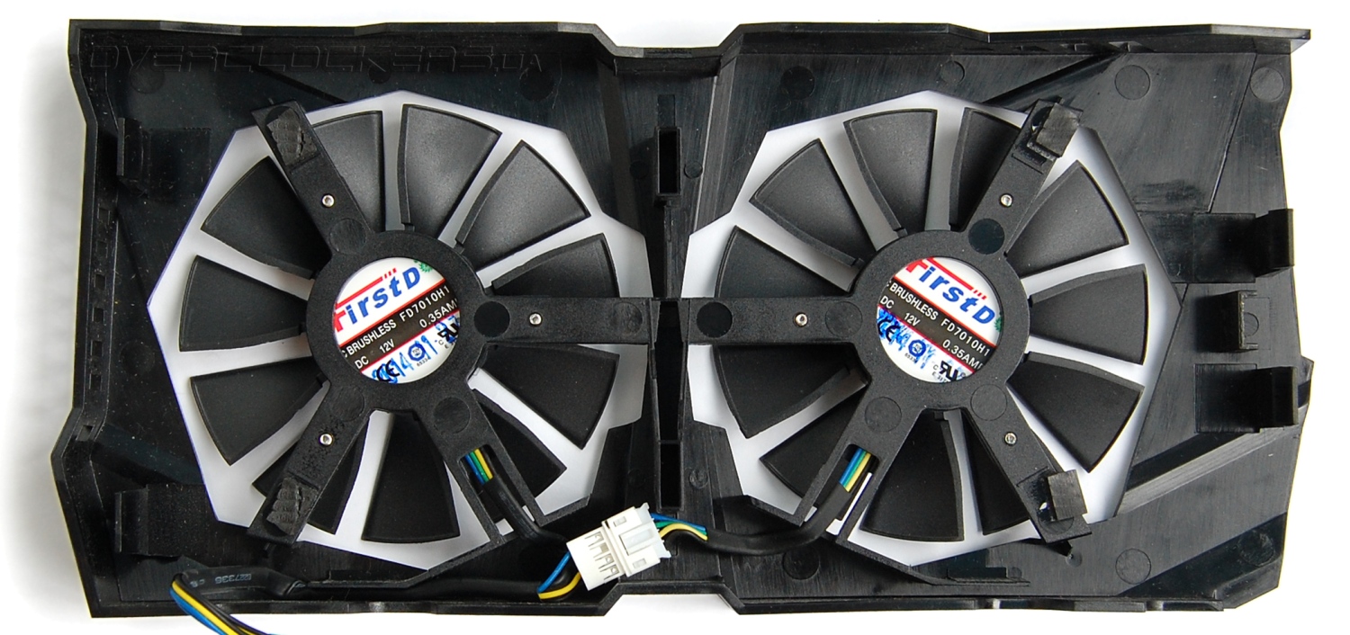 В системе охлаждения DirectCU II используется два небольших вентиляторов. Кожух напоминает по дизайну старшие видеоадаптеры ASUS, но выполнен из пластика.