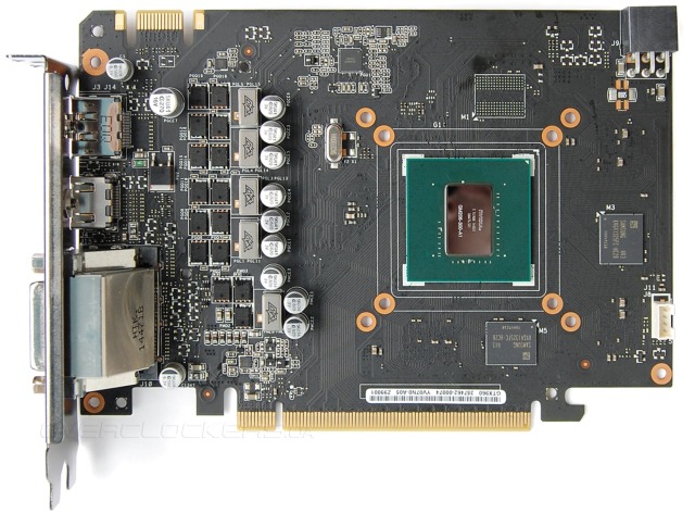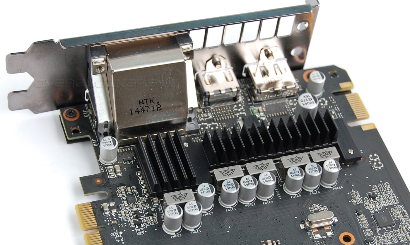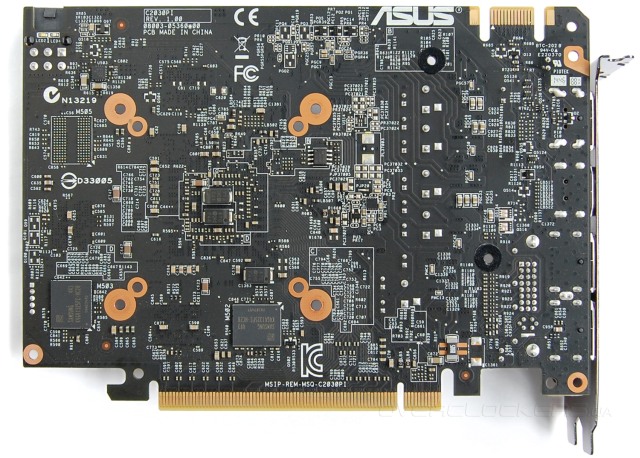 Вся задняя часть текстолита закрыта металлической пластиной. Это придает солидности небольшой видеокарте, хотя практической пользы от такого конструктивного элемента нет — радиатором не является, а проблема деформация столь малой платы с легким кулером не актуальна.