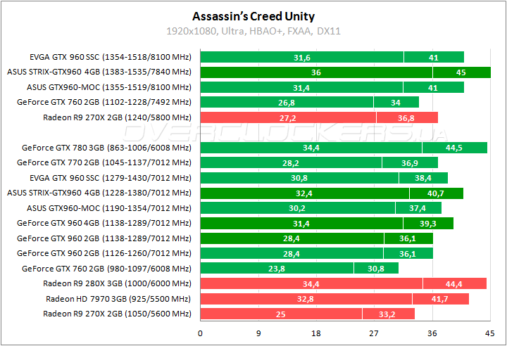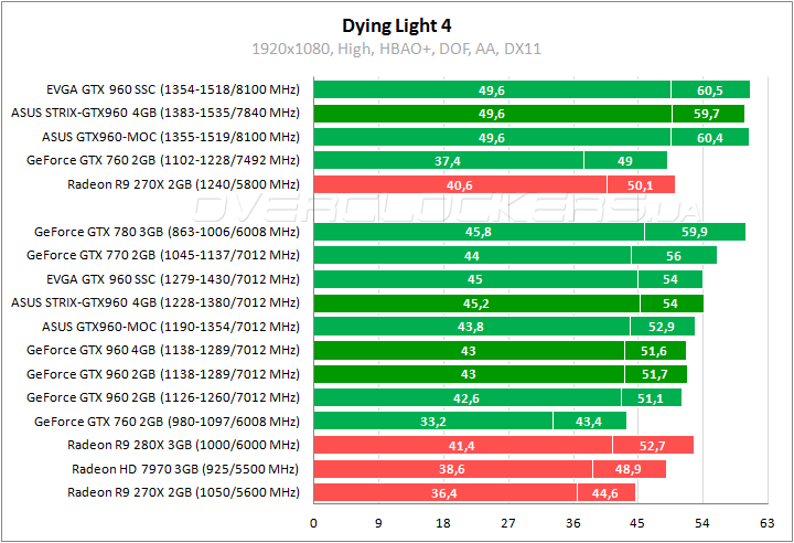 Для наглядности на графиках GeForce GTX 960 с одинаковыми частотами ядра в 1289 МГц выделены единым цветом, как и все данные для ASUS STRIX-GTX960-DC2OC-4GD5. Сами участники NVIDIA девятисотой серии сгруппированы в соответствии с ростом их заводских частот — от меньших значений к большим.