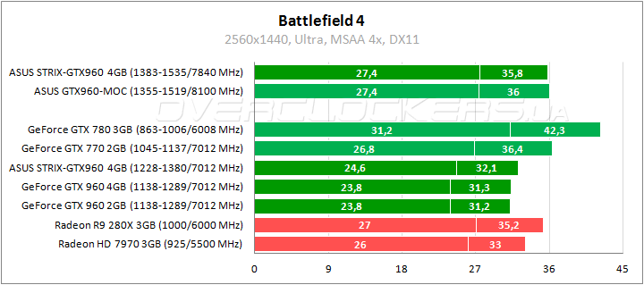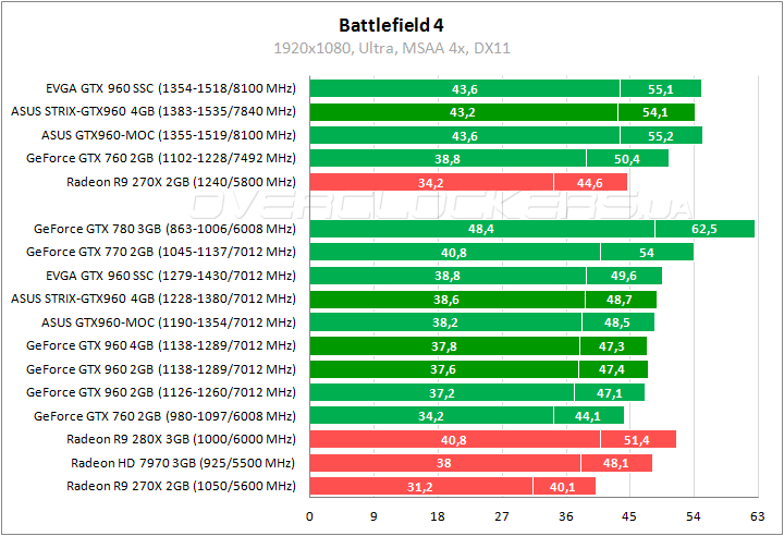 При разрешении Full HD в Battlefield 4 незаметно никакого роста от увеличенного объема памяти. Результаты ASUS строго вписываются в «пирамиду» остальных результатов GeForce GTX 960. В разгоне Strix уступает 1–2% картам с более быстрой памятью.