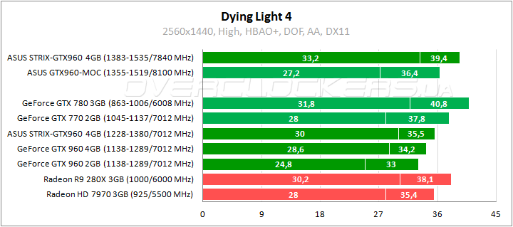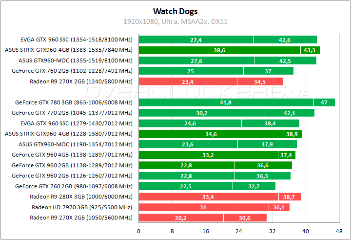 Большой объем памяти избавляет от периодических резких просадок fps в Watch Dogs. В итоге вновь наблюдается внушительный разрыв по минимальному fps между GeForce GTX 960 с разным объемом памяти — примерно 45%. Повышенные частоты ASUS Strix обеспечивают не только стабильную высокую производительность в номинале, но и более высокие результаты в сравнении с Radeon R9 280X. GeForce GTX 770 проигрывает только по минимальному параметру, но явно из-за памяти 2 ГБ. Прирост от разгона 11%.