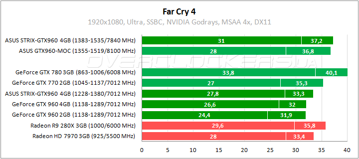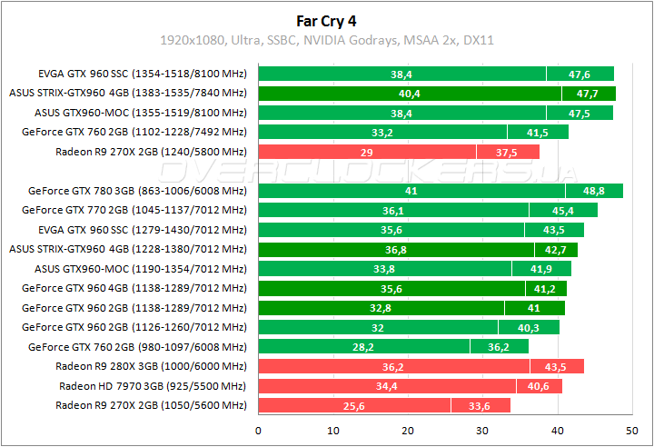 При сравнении одинаковых частотных конфигураций с разным объемом памяти в Far Cry 4 вновь видим различия в основном по минимальному fps — более 8%. ASUS Strix практически не уступает Radeon R9 280X в номинале, а при разгоне быстрее собратьев с более быстрой памятью. У решений NVIDIA загрузка памяти на уровне 2,5 ГБ, а у Radeon она превышает 2,8 ГБ.