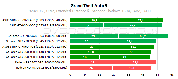 При выбранных настройках в GTA 5 наблюдается мизерное преимущество 4 ГБ над 2 ГБ. ASUS Strix производительнее Radeon HD 7970, а с разгоном легко обгоняет Radeon R9 280X.