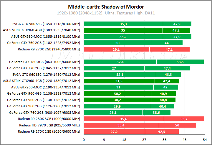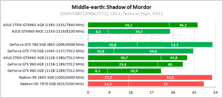 Разница между GeForce GTX 960 с разным объемом видеобуфера до 9% по минимальному fps. Но при разгоне преимущество более внушительное. Немного увеличивается отставание от Radeon R9 280X, но оно легко компенсируется разгоном Strix. Загрузка памяти более 2,9 ГБ.
