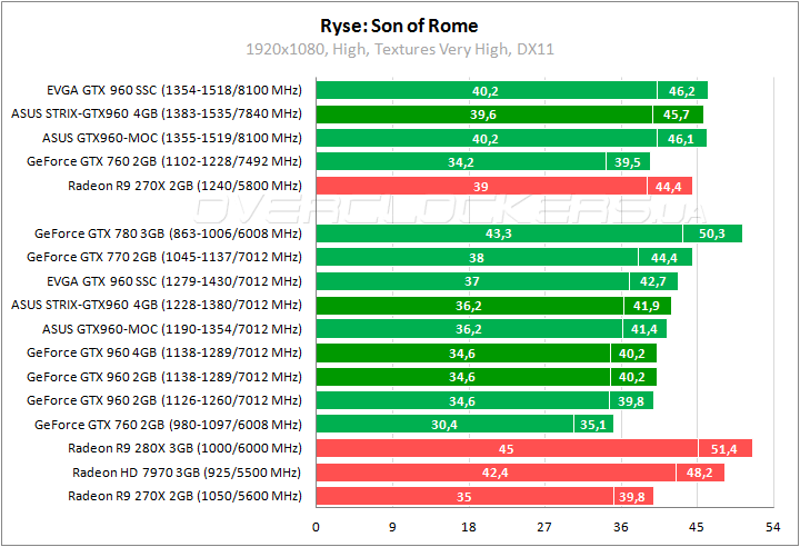 Никакой разницы между GeForce GTX 960 с разным объемом памяти. ASUS Strix на заводских частотах на 5% быстрее референса, результаты на уровне Radeon HD 7970. Разгон позволяет обогнать Radeon R9 280X. Загрузка памяти 1,8 ГБ. Проводить тесты в более высоком разрешении нет смысла, потому как даже в Full HD со сглаживанием комфортный уровень fps обеспечивается только при разгоне.