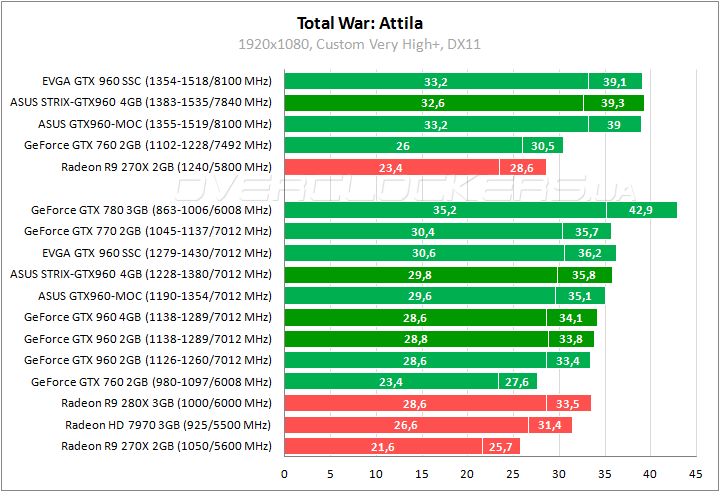 Бенчмарку Attila по силам загрузить 2,3 ГБ, и физический объем видеобуфера немного сказывается на результатах, но минимально. При одинаковых частотах GeForce с большим объемом выигрывает менее 1%. Strix при заводских частотах производительнее Radeon R9 280X, с разгоном уверенно оставляет позади еще GeForce GTX 770.