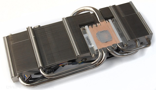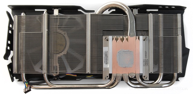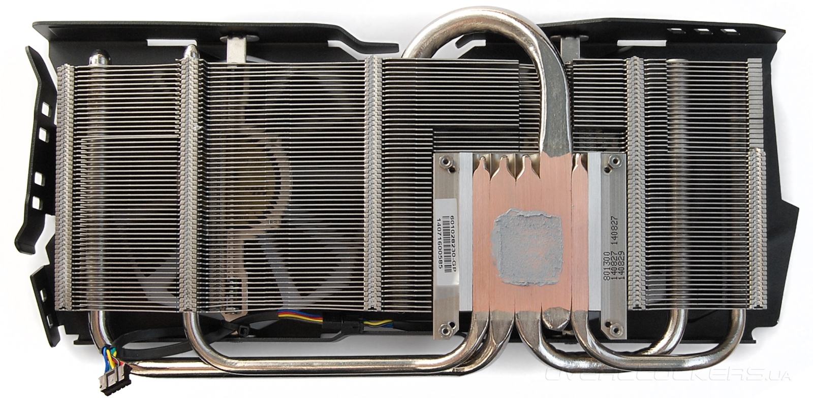 Никаких изменений в конструкции кулера не произошло. Точно такая же система охлаждения устанавливалась на GeForce GTX 780 и GeForce GTX 780 Ti. Пять тепловых трубок проходят через основание, напрямую контактируя с графическим процессором. При этом из-за меньшей площади ядра боковые трубки с кристаллом не соприкасаются.