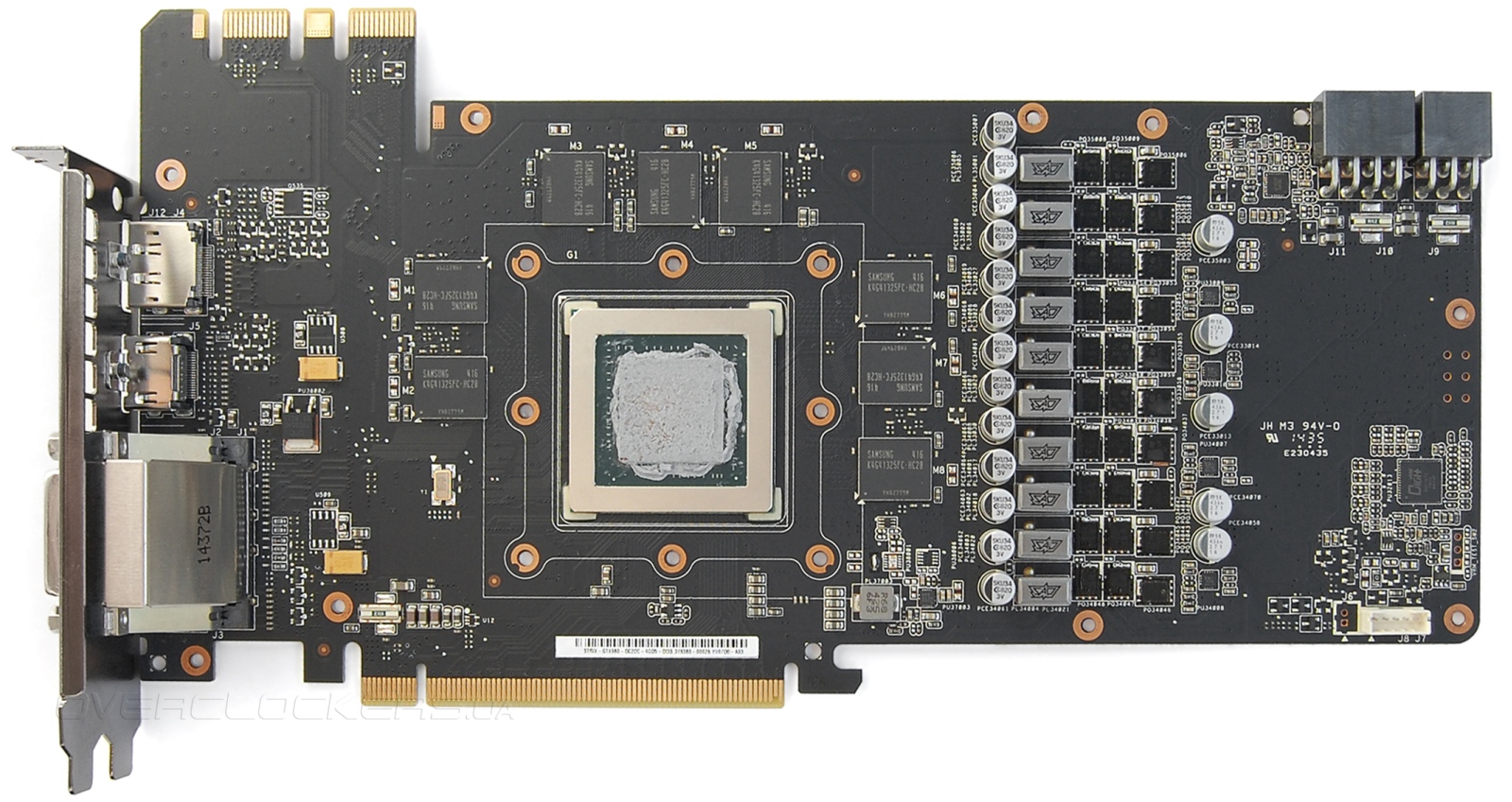 Печатная плата Г-образной формы. Боковой отросток нужен, чтобы вывести разъемы для SLI за пределы массивного широкого кулера. За основу взят дизайн старших GeForce семисотой серии в исполнении ASUS, изменения минимальны.