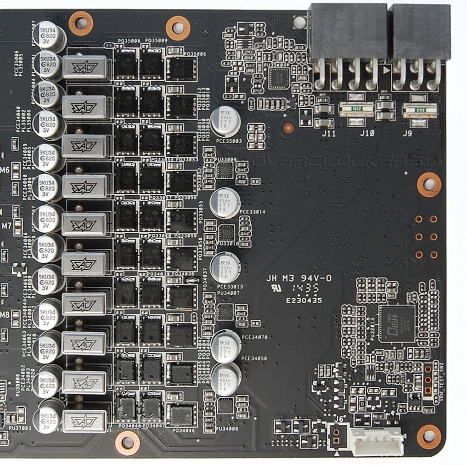 Графический процессор запитан от восьмифазного преобразователя напряжения на базе контроллера DIGI+ ASP1212. Память запитана от двух фаз. Плата выполнена по технологии Super Alloy Power, что подразумевает использование высококачественных электронных компонентов с повышенным сроком службы.