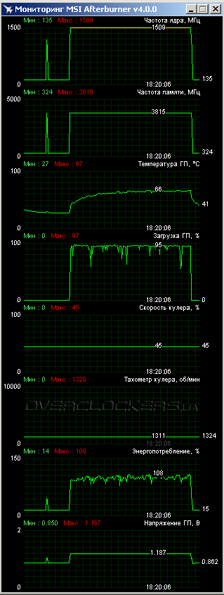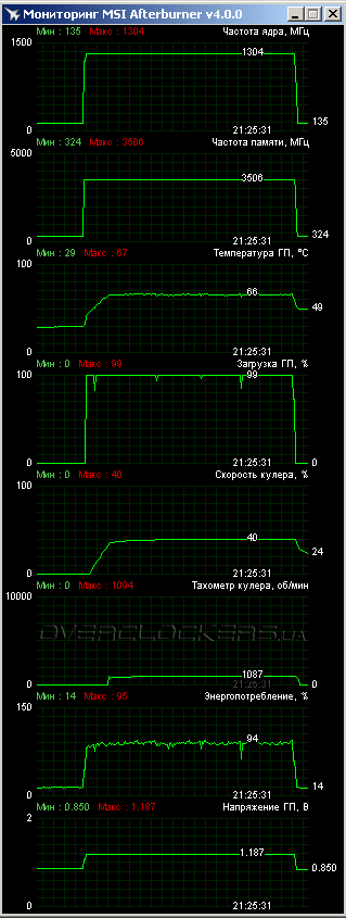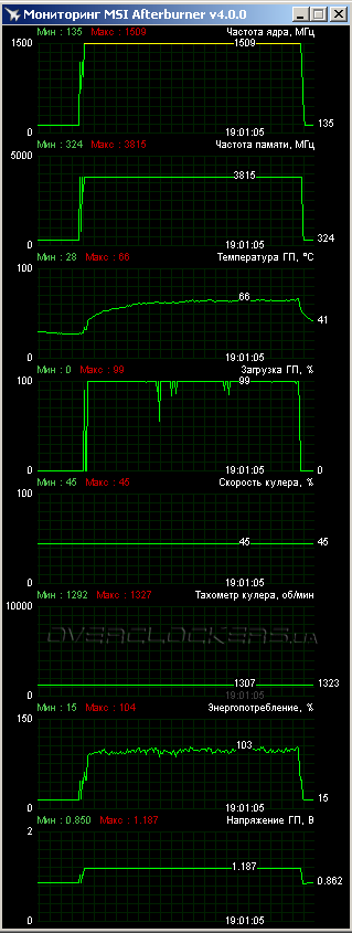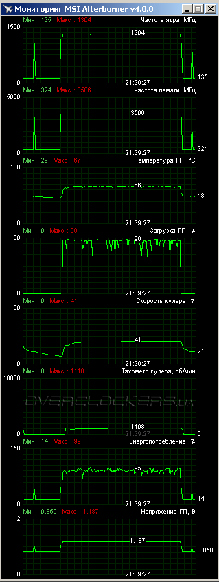 По верхним скриншотам видно, что вентиляторы стартуют без резкого скачка, как это было у Strix GeForce GTX 780. Остановка вентиляторов после прогрева тоже происходит быстро. Это уже связано пониженным тепловыделением графического процессора, который легче охладить.