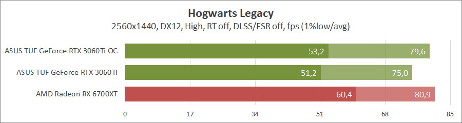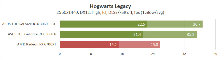 Тестирование в игровых бенчмарках проводилось при разрешении 2560х1440 и 1920х1080 с пресетами качества графики Ultra или High в Hogwarts Legacy. Также были добавлены режимы с активированными, где это возможно, параметрами трассировки лучей. Дополнительно проводилось тестирование с технологиями DLSS или FSR в трудных для видеокарт играх. HD-текстуры в Far Cry 6 не использовались. В Hogwarts Legacy происходила пробежка в течение минуты через городок Hogsmeade в сторону Old Fool с автоматическим построением пути на игровой карте. 3DMark задействован со стандартными настройками.
