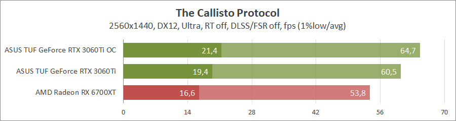 В QHD этот проект оказывается трудным для всех, хороший средний fps омрачают редкие события, что не позволит нормально наслаждаться игрой. Для продукта Nvidia включение DLSS позволяет исправить ситуацию.