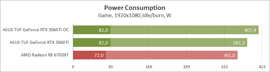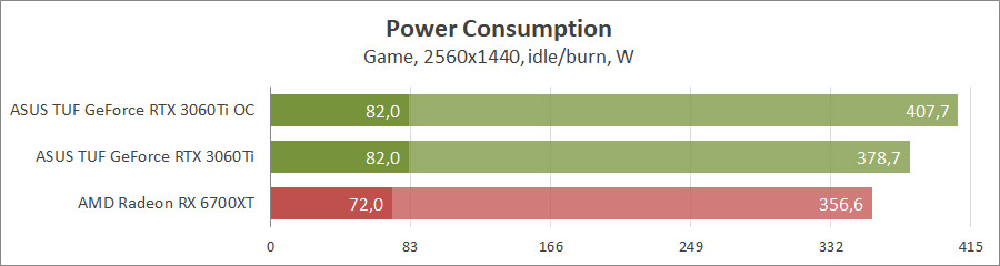 Система с GeForce RTX 3060 Ti у Quad HD потребляет больше энергии, чем с Radeon, разгон добавляет еще 30 ватт.