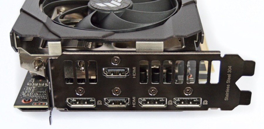 Сзади видеокарта закрыта металлической пластиной. Сбоку есть окошко, чтобы создавать меньше сопротивления воздушным потокам внутри корпуса.