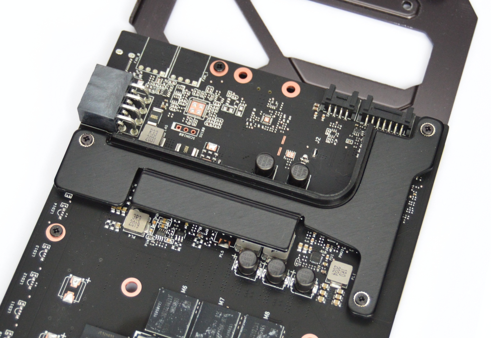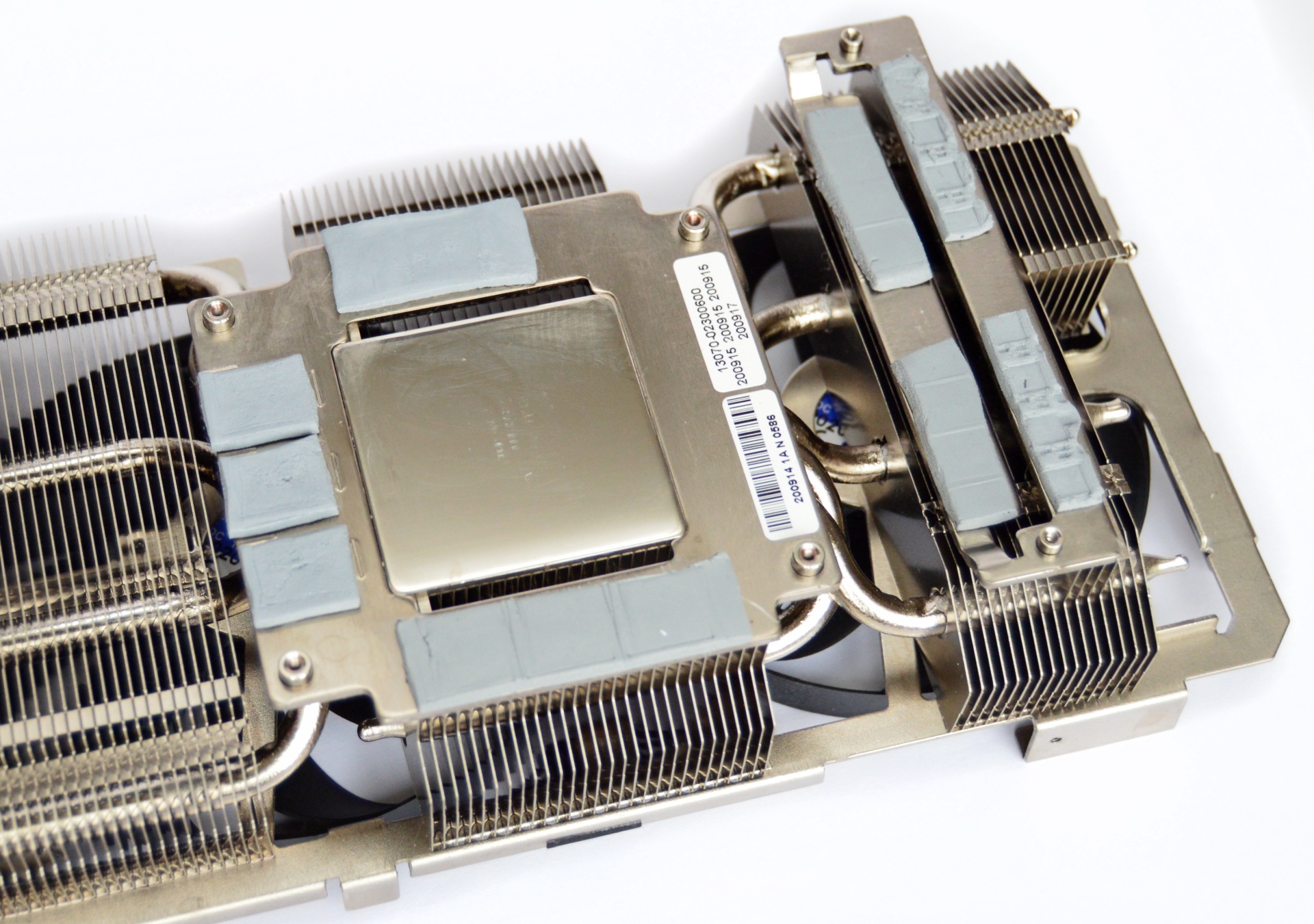 Основание радиатора обработано по технологии ASUS MaxContact для идеально ровной поверхности и лучшего прилегания к поверхности графического кристалла. По периметру основания есть площадка для отвода тепла от микросхем памяти. Сбоку предусмотрены площадки для контакта с силовыми элементами и дросселями.