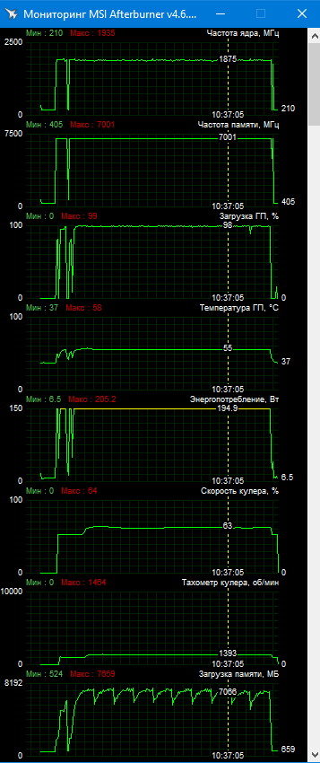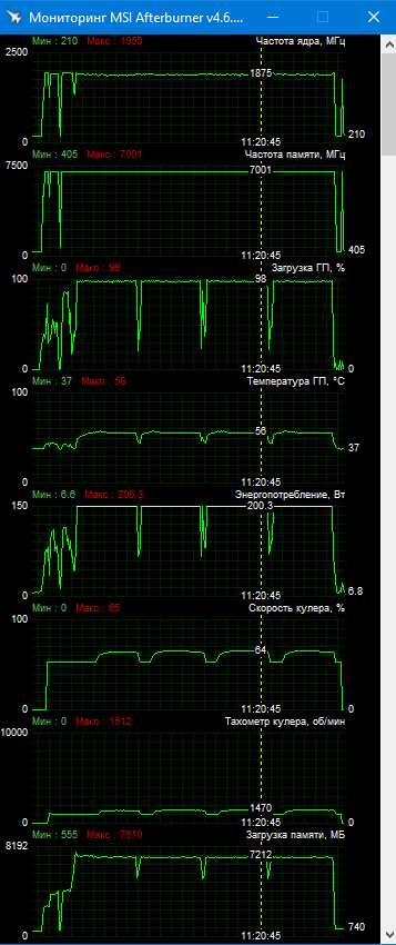 Тестирование проводилось в открытом корпусе Antec NX800 при температуре в помещении 22 °C. Задействован стандартный режим Performance. В таких условиях температура GPU не превышала 58 °C, что на несколько градусов меньше, чем у ASUS TUF RTX 3070. Вентиляторы раскручивались до 1100–1500 об/мин, в простое при низком нагреве они полностью останавливаются. Рабочий диапазон Boost в играх был 1875–1935 МГц с пиковыми значениями до 1950 МГц. Ниже это проиллюстрировано на скриншотах мониторинга во время нагрузки бенчмарками Bright Memory: Infinite RTX и Horizon Zero Dawn в разрешении 4K.
