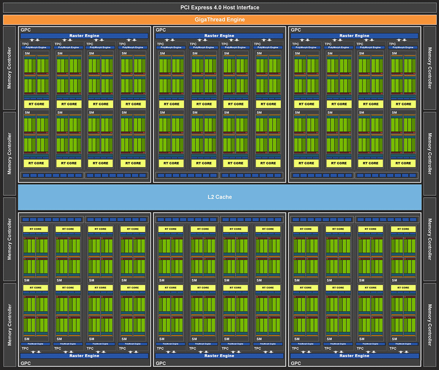 Вначале кратко напомним характеристики. Подробный разбор архитектуры Ampere был представлен в соответствующем обзоре. В основе GeForce RTX 3070 процессор GA104 c шестью кластерами GPC и 48 массивами SM. Но активно 46 SM c 5888 потоковыми процессорами CUDA, 184 текстурными блоками, 184 тензорными ядрами, 46 ядрами RT и 96 блоками растеризации. В процессорах Ampere задействованы более быстрые RT-ядра второго поколения и тензорные ядра третьего поколения. Объем кэш-памяти L2 у GA104 достигает 4 МБ.