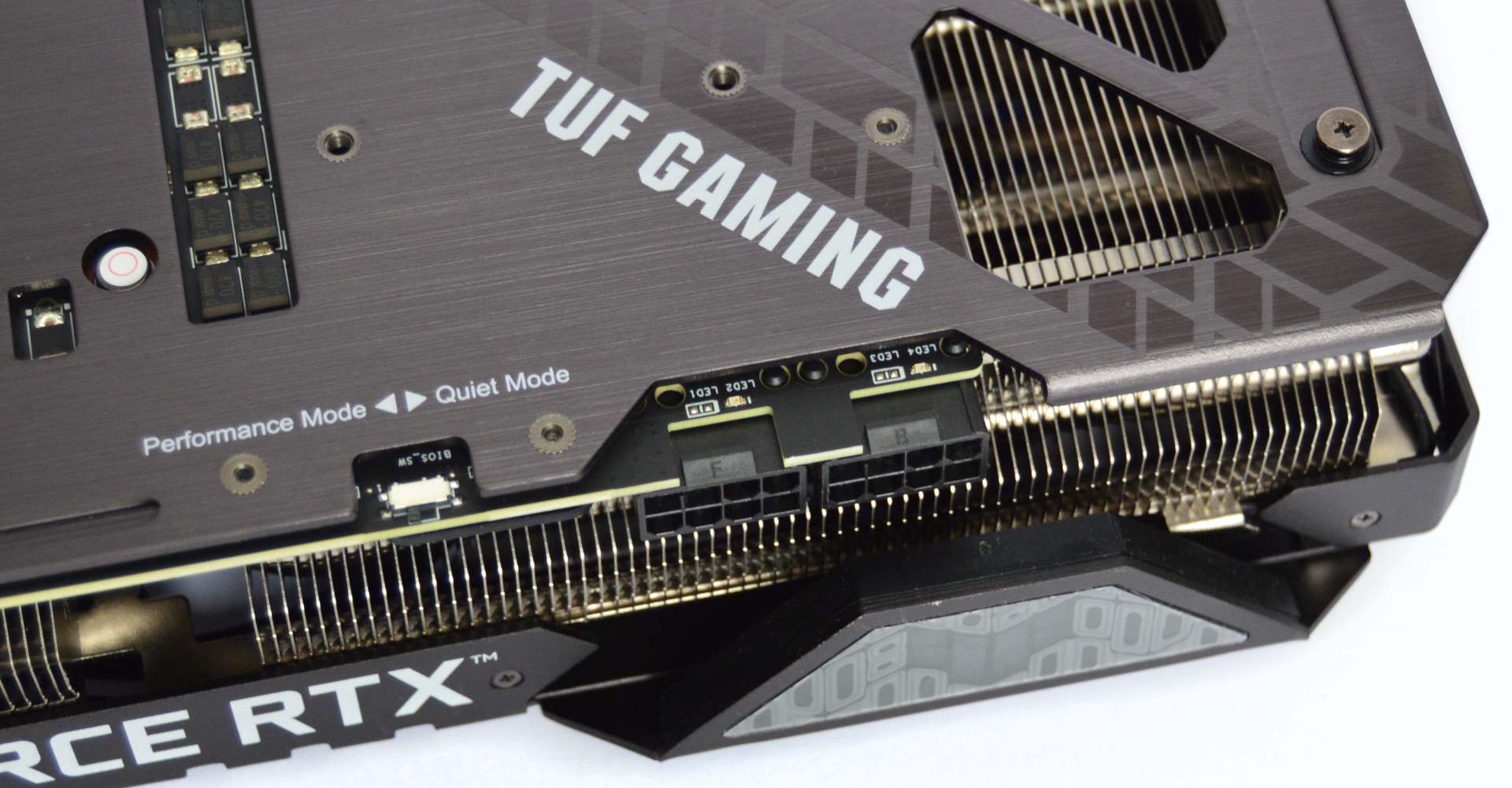 Видеокарта оснащена двумя разъемами питания по восемь контактов. Возле них есть переключатель BIOS для выбора режимов Performance или Quiet, различающиеся скоростью вентиляторов и шумом.