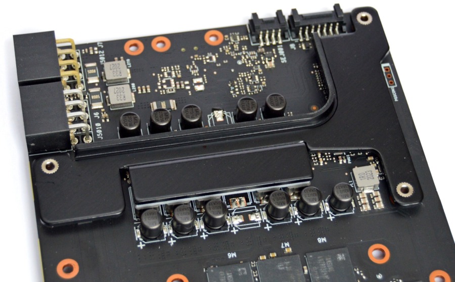 В старших моделях ASUS TUF охлаждение VRM разделено — половина силовых компонентов охлаждается общим радиатором, вторая половина имеет отдельный радиатор с тепловой трубкой. Тут мы имеем нечто подобное, но в упрощенном варианте, с максимально простым дополнительным радиатором.