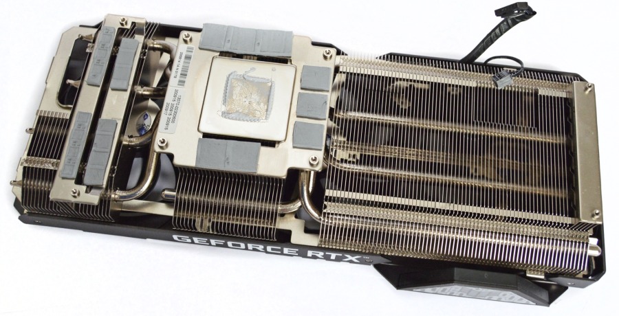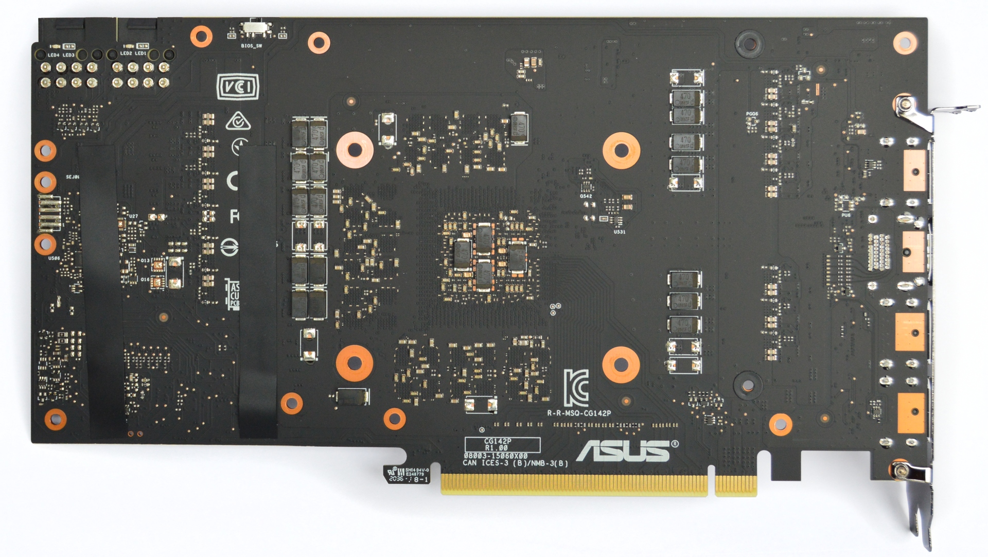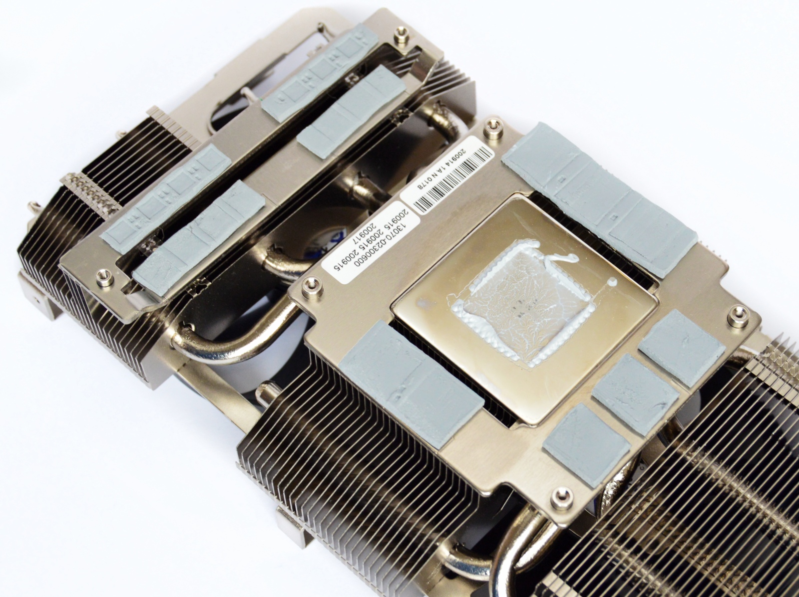 Основание радиатора обработано по технологии ASUS MaxContact, обеспечивающей идеально ровную поверхность для лучшего прилегания к поверхности графического кристалла. По периметру основания есть площадка для отвода тепла от микросхем памяти. Сбоку предусмотрены площадки для контакта с силовыми элементами и дросселями.