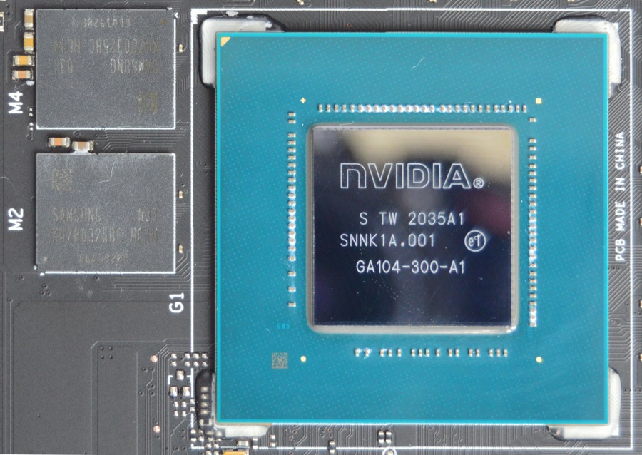 Видеокарта использует процессор GA104-300-A1. Вокруг него распаяно восемь микросхем памяти GDDR6 Samsung K4Z80325BC HC14.
