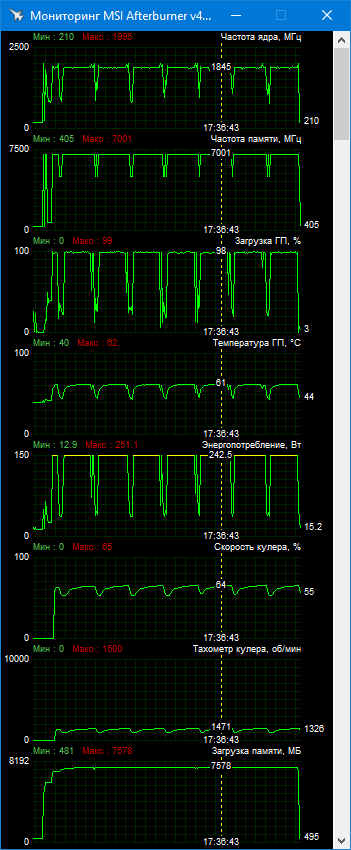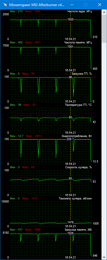Тестирование проводилось внутри открытого корпуса Antec NX800 при температуре в помещении 23 °C. По умолчанию видеокарта работает в режиме Performance. С такими установками температура GPU не превышала 62 °C, скорость вентиляторов держалась в рамках 1500 об/мин. Рабочий диапазон частот Boost в районе 1900–1950 МГц, с пиковыми значениями до 2010 МГц. Ниже это проиллюстрировано на скриншотах мониторинга во время нагрузки бенчмарками Bright Memory: Infinite RTX и Horizon Zero Dawn в 4K.