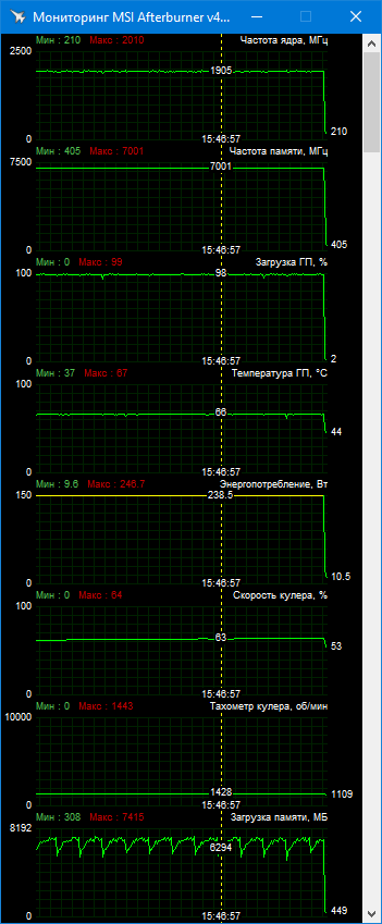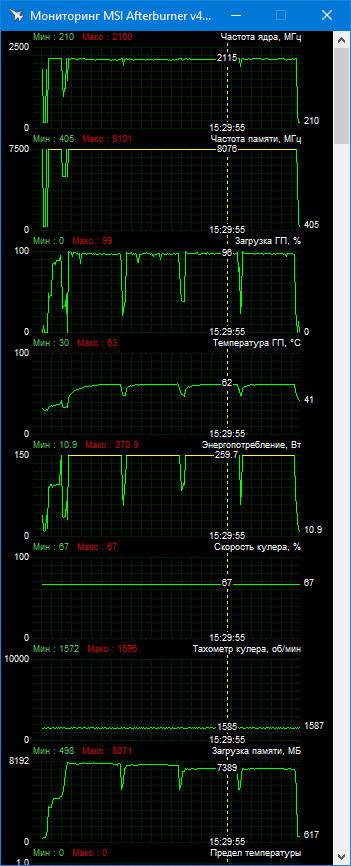 При фиксации скорости вентиляторов на 1600 об/мин удалось сохранить температуры в пределах 64 °C.