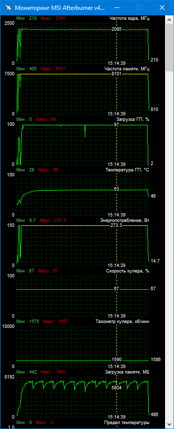Без особых проблем мы подняли частоту ядра на 150 МГц, что в сочетании с повышенным лимитом мощности (+12%) обеспечило частоты Boost около 2100 МГц (пиковые значения до 2160 МГц). Итоговый разгон памяти составил 16150 МГц, что на 15% выше начального значения.