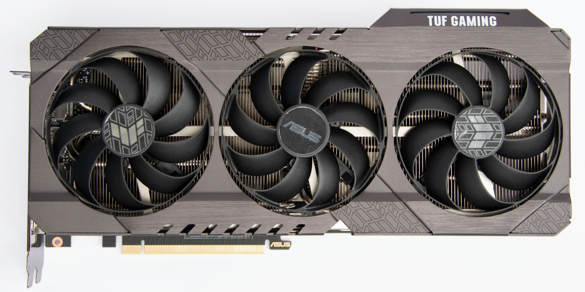 ASUS TUF Gaming GeForce RTX 3080 занимает неполные три слота, он выполнен в форм-факторе 2,7 слота (толщина 51,6 см). Данная модель чуть тоньше ASUS TUF Gaming Radeon RX 6800 XT.